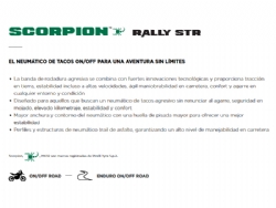 Neumático Pirelli Scorpion Rally Str 100/90/19 V57 F 2865300. Scorpion Rally Str es el neumático diseñado para la aventura en carretera y tierra. Dispone de una banda de rodadura innovadora para ofrecer la mejor tracción en tierra, estabilidad a altas velocidades, ágil maniobrabilidad en carretera, confort y agarre en cualquier entorno y condición. Diseñado para motorista que van buscando una rueda de tacos agresiva pero no quieren renunciar al agarre, seguridad en mojado, alto kilometraje, estabilidad y confort. Mayor anchura y contorno del neumático con una huella de pisada mayor para ofrecer una estabilidad superior. Perfiles y estructuras de neumático trail de asfalto para transmitir mayor manejabilidad en asfalto. Precio por neumático.