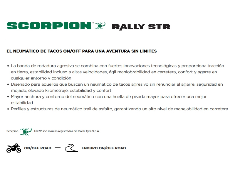 Neumático Pirelli Scorpion Rally Str 120/70/18 V59 TL 3114900. Scorpion Rally Str es el neumático diseñado para la aventura en carretera y tierra. Dispone de una banda de rodadura innovadora para ofrecer la mejor tracción en tierra, estabilidad a altas velocidades, ágil maniobrabilidad en carretera, confort y agarre en cualquier entorno y condición. Diseñado para motorista que van buscando una rueda de tacos agresiva pero no quieren renunciar al agarre, seguridad en mojado, alto kilometraje, estabilidad y confort. Mayor anchura y contorno del neumático con una huella de pisada mayor para ofrecer una estabilidad superior. Perfiles y estructuras de neumático trail de asfalto para transmitir mayor manejabilidad en asfalto. Precio por neumático.