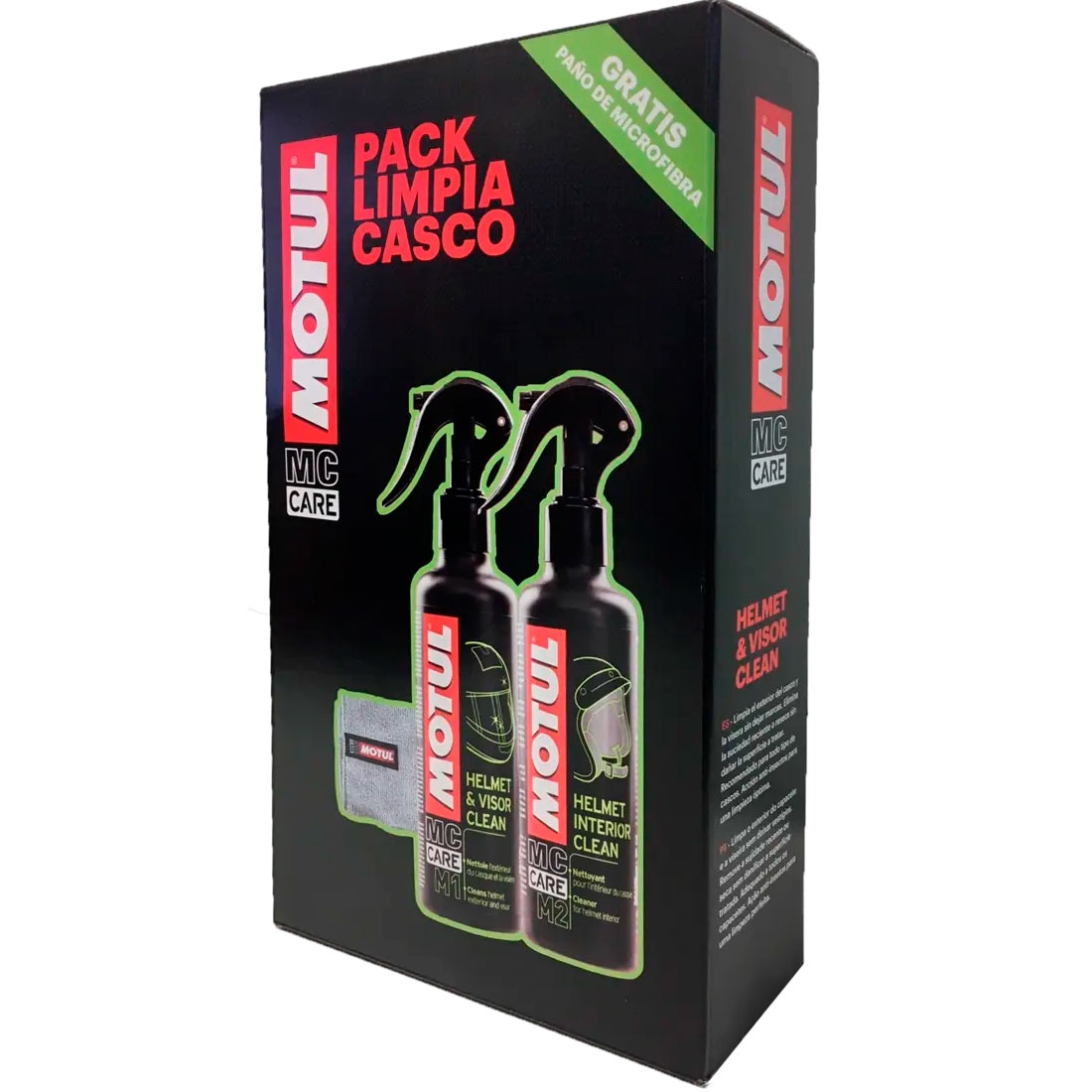Pack Motul Limpia Casco. El nuevo pack de limpieza para cascos de Motul ha sido diseñado para la limpieza en profundidad de cualquier tipo de casco. Gracias a sus envases con pulverizador permite una limpieza cómoda y sin agua. Compuesto por un Helmet Interior Clean de 250ml, higienizante y bactericida que elimina los malos olores y las bacterias sin necesidad de frotar, y un Helmet & Visor Clean de 250ml, producto efectivo tanto para la visera como para el resto del casco que disuelve la suciedad creando una película protectora antisuciedad y antimosquitos. El pack incluye un bayeta de microfibra de regalo, para una limpieza eficaz y sin arañazos de toda la superficie del casco.