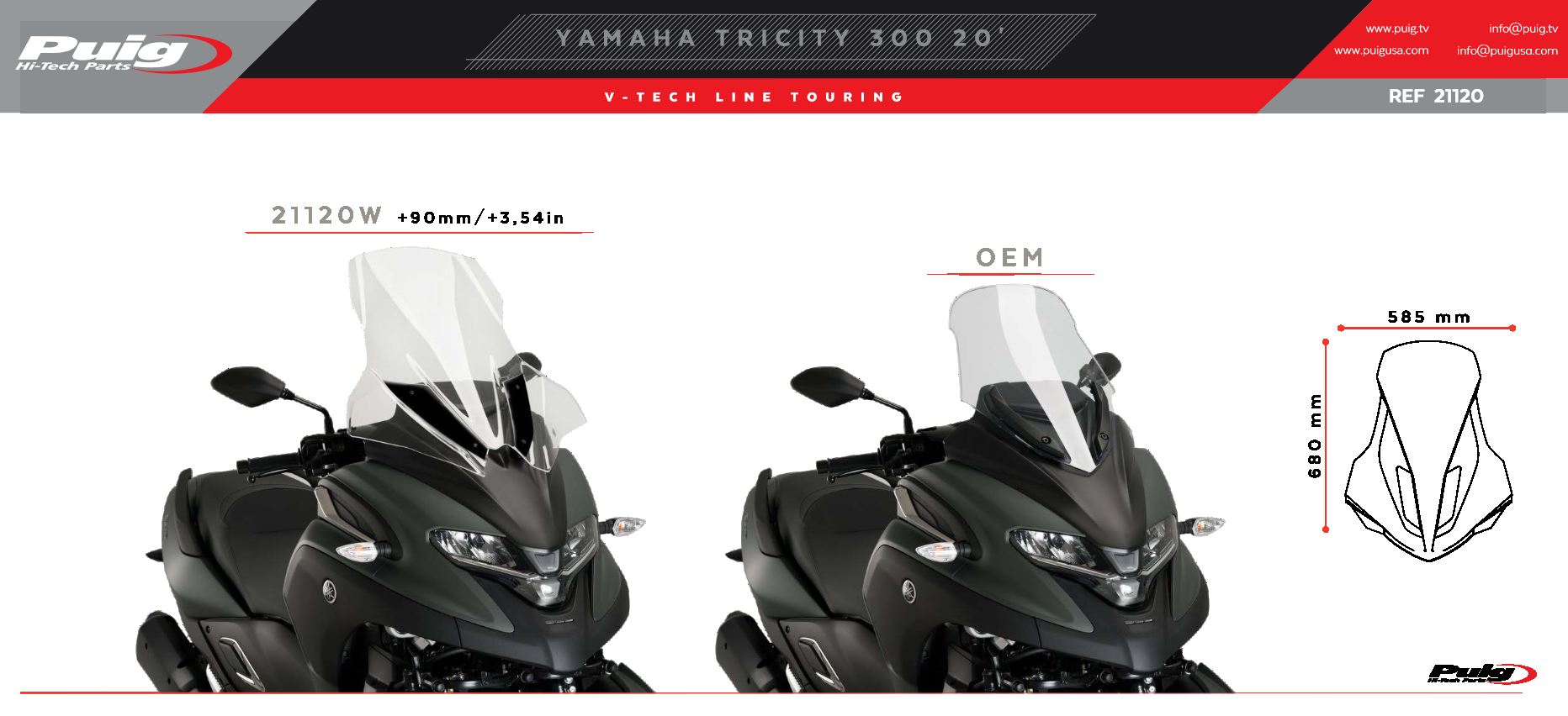 Pantalla Puig 21120F V-Tech Line Touring Yamaha Tricity 300 2020-2022. Su diseño es específico para la Yamaha Tricity 300 2020-2022 y mejora notablemente la aerodinámica y la disminución del efecto del viento sobre el casco. De la resistencia se encarga un acrílico de alto impacto con 4 mm de grosor (según modelo) que garantiza la máxima durabilidad y acabados impecables. Para facilitar el montaje, Puig sirve junto al carenabris con las correspondientes instrucciones. Homologación ABE 3818 y TÜV. Homologación ABE 3818 y TÜV.