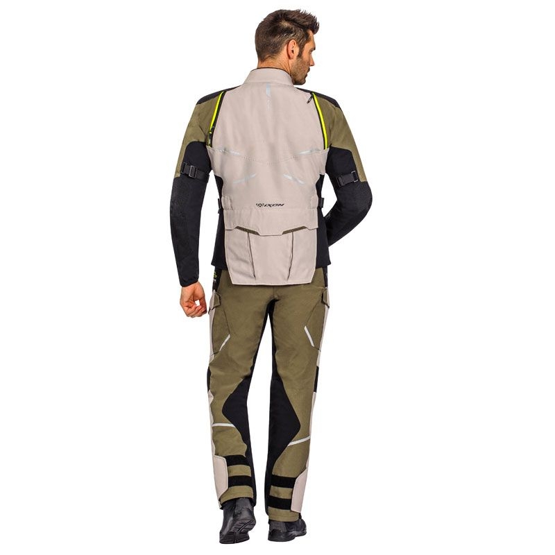Pantalón Ixon Eddas Greige / Khaki / Negro. El pantalon Ixon Eddas es una de las novedades de la gama Adventure 2021 de Ixon, pensado para cubrir largas distancias por adversas que sean las condiciones climatológicas. Gracias a su membrana X-Dry de 20.000mm de impermeabilidad y 10,000 G/m2 de transpirabilidad nos mantendrá secos en cualquier condición. Sus ventilaciones en la zona de los muslos y su forro térmico extraíble de 80 gramos lo convierten en un pantalón polivalente y funcional. Con ajustes en mediante correa de velcro en la cintura, tirantes ajustables y desmontables, paneles flexibles por encima de las rodillas, y ajustes con doble tira de velcro en los bajos nos garantiza un ajuste y confort total. Confeccionados en Poliester 600D y Ripstop, refuerzos 1200D en rodillas obtiene una calificación de resistencia a la abrasión AA. Combinándolos con la chaqueta Eddas mediante la cremallera de unión conseguimos una equipación de alta calidad a un precio muy competitivo.
