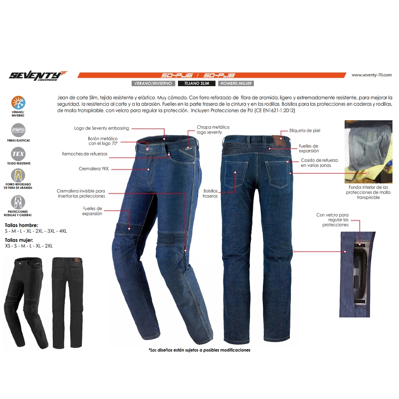 Pantalón Seventy Degrees SD-PJ8 Slim Fit Azul Oscuro (colección 2021). Pantalón vaquero para moto Seventy Degrees SD-PJ8 de corte slim para mujer y que se caracteriza por ser muy confortable, ligero y seguro. Confeccionado con tejido resistente, duradero y ligeramente elástico, cuenta con forro interior reforzado en fibra de aramida que le confiere mayor seguridad y altos niveles de resistencia al corte y a la abrasión. El pantalón Seventy Degrees SD-PJ8 dispone además de protectores certificados por la CE en caderas y rodillas (extraíble y regulables) y diferentes bolsillos. El pantalón SD-PJ8 cuenta con la versión SD-PJ6 con patronaje específico de hombre.