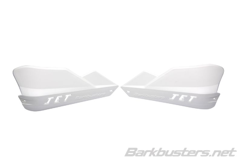 Paramanos Barkbusters JET JET-003-WH sin barras blanco. Los paramanos Barkbusters JET Handguard poseen un diseño universal que se adapta a la mayoría de motos dual-sport, enduro y trail del mercado. Se sirve par (izquierdo y derecho) con tornillos de montaje y sin barras.