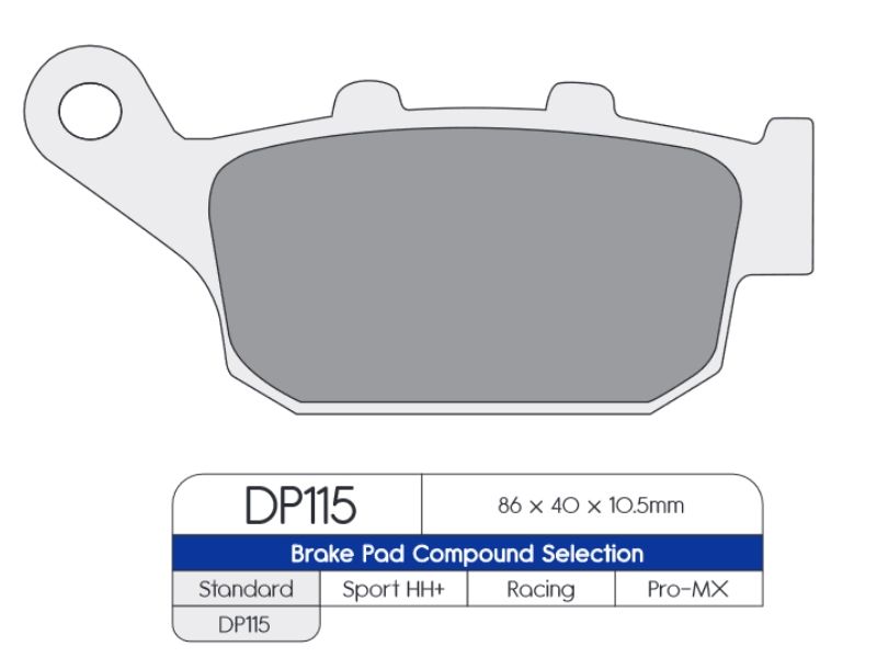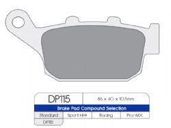 Pastillas freno Dp Brakes DP115 Standard. Las pastillas de freno sinterizadas estándar DP proporcionan una óptima frenada tanto en caliente como en frío y en condiciones de mojado o seco. El periodo de rodaje es muy reducido, obteniendo el máximo rendimiento en un tiempo reducido. Diseñadas y fabricadas con materiales de garantizan una frenada muy buena y un rendimiento absoluto. El material cerámico (a base de óxido) de aluminio de color gris en la placa posterior mantiene el calor alejado del pistón de la pinza de freno para un rendimiento más estable. Las pastillas de freno sinterizadas estándar DP nos son abusivas en la mayoría de los discos, generan muy poco polvo en los frenos y además son muy silenciosas. Cada juego de pastillas de freno Dp Brakes contiene lo necesario para una pinza. La imagen mostrada de las pastillas de freno Dp Brakes DP115 puede ser genérica.