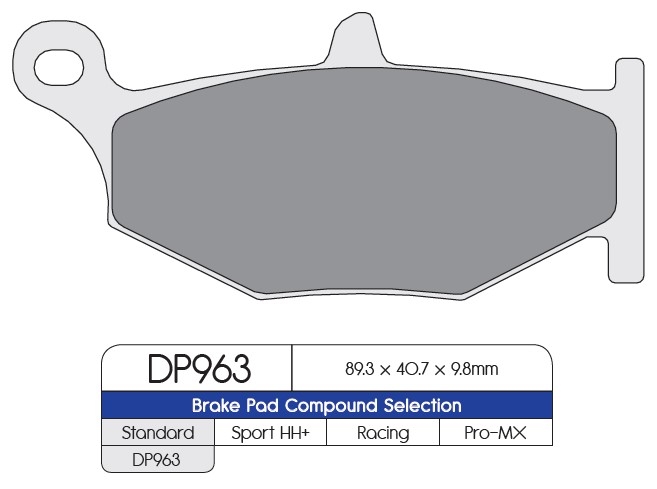 Pastillas freno Dp Brakes DP963 Standard. Las pastillas de freno sinterizadas estándar DP proporcionan una óptima frenada tanto en caliente como en frío y en condiciones de mojado o seco. El periodo de rodaje es muy reducido, obteniendo el máximo rendimiento en un tiempo reducido. Diseñadas y fabricadas con materiales de garantizan una frenada muy buena y un rendimiento absoluto. El material cerámico (a base de óxido) de aluminio de color gris en la placa posterior mantiene el calor alejado del pistón de la pinza de freno para un rendimiento más estable. Las pastillas de freno sinterizadas estándar DP nos son abusivas en la mayoría de los discos, generan muy poco polvo en los frenos y además son muy silenciosas. Cada juego de pastillas de freno Dp Brakes contiene lo necesario para una pinza. La imagen mostrada de las pastillas de freno Dp Brakes DP963 puede ser genérica.