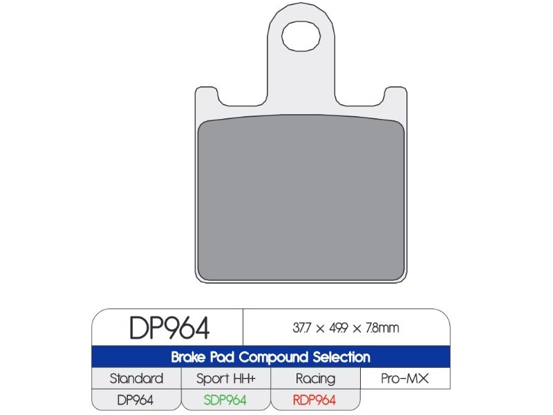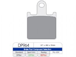 Pastillas freno Dp Brakes DP964 Standard. Las pastillas de freno sinterizadas estándar DP proporcionan una óptima frenada tanto en caliente como en frío y en condiciones de mojado o seco. El periodo de rodaje es muy reducido, obteniendo el máximo rendimiento en un tiempo reducido. Diseñadas y fabricadas con materiales de garantizan una frenada muy buena y un rendimiento absoluto. El material cerámico (a base de óxido) de aluminio de color gris en la placa posterior mantiene el calor alejado del pistón de la pinza de freno para un rendimiento más estable. Las pastillas de freno sinterizadas estándar DP nos son abusivas en la mayoría de los discos, generan muy poco polvo en los frenos y además son muy silenciosas. Cada juego de pastillas de freno Dp Brakes contiene lo necesario para una pinza. La imagen mostrada de las pastillas de freno Dp Brakes DP964 puede ser genérica.