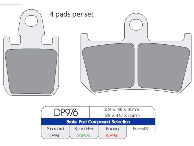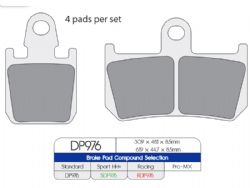 Pastillas freno Dp Brakes DP976 Standard. Las pastillas de freno sinterizadas estándar DP proporcionan una óptima frenada tanto en caliente como en frío y en condiciones de mojado o seco. El periodo de rodaje es muy reducido, obteniendo el máximo rendimiento en un tiempo reducido. Diseñadas y fabricadas con materiales de garantizan una frenada muy buena y un rendimiento absoluto. El material cerámico (a base de óxido) de aluminio de color gris en la placa posterior mantiene el calor alejado del pistón de la pinza de freno para un rendimiento más estable. Las pastillas de freno sinterizadas estándar DP nos son abusivas en la mayoría de los discos, generan muy poco polvo en los frenos y además son muy silenciosas. Cada juego de pastillas de freno Dp Brakes contiene lo necesario para una pinza. La imagen mostrada de las pastillas de freno Dp Brakes DP976 puede ser genérica.