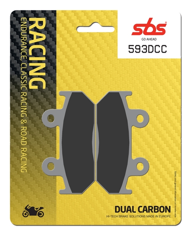 Pastillas freno SBS 593-DCC. Avaladas por numerosos títulos mundiales, las pastillas de freno SBS P593DCC compuesto DC (Dual Carbon), han sido desarrolladas a partir de toda la experiencia adquirida en los campeonatos del mundo Superbike y Moto 2. Este nuevo compuesto ofrece una mordida inicial superior, además de mayor rendimiento general y una durabilidad superior. Su funcionamiento óptimo es a altas temperaturas, por lo que se recomienda sólo su uso en circuito. Precio por juego. Adjuntamos un PDF con el catalogo SBS para más información sobre compatibilidades con cada modelo de moto.