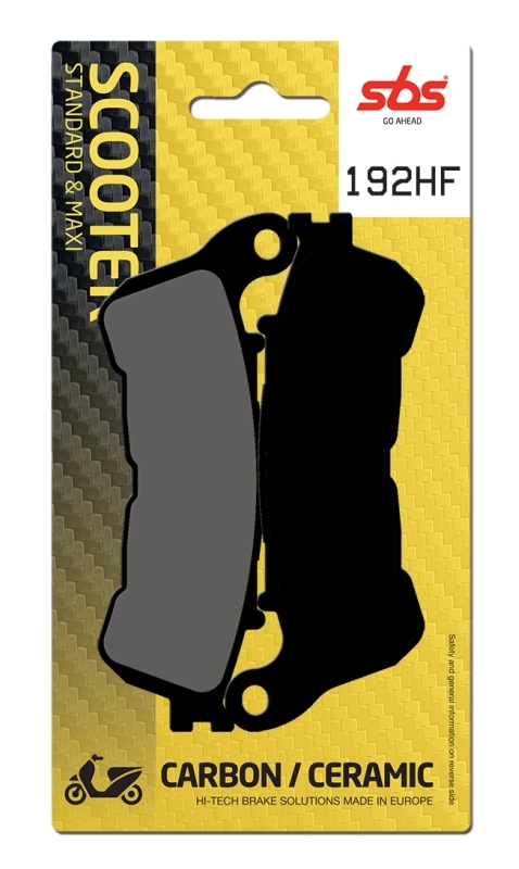 Pastillas freno Sbs 192-HF. Las pastillas de freno para scooters Sbs 192-HF (compuesto HF cerámico), ofrecen una frenada estable, indistintamente si el freno es delantero o trasero. Se caracterizan por su alto nivel de confort y larga duración. También ofrecen una óptima protección al disco de freno sobre cualquier condición climática. Precio por juego. Adjuntamos un PDF con el catalogo SBS para más información sobre compatibilidades con cada modelo de moto.