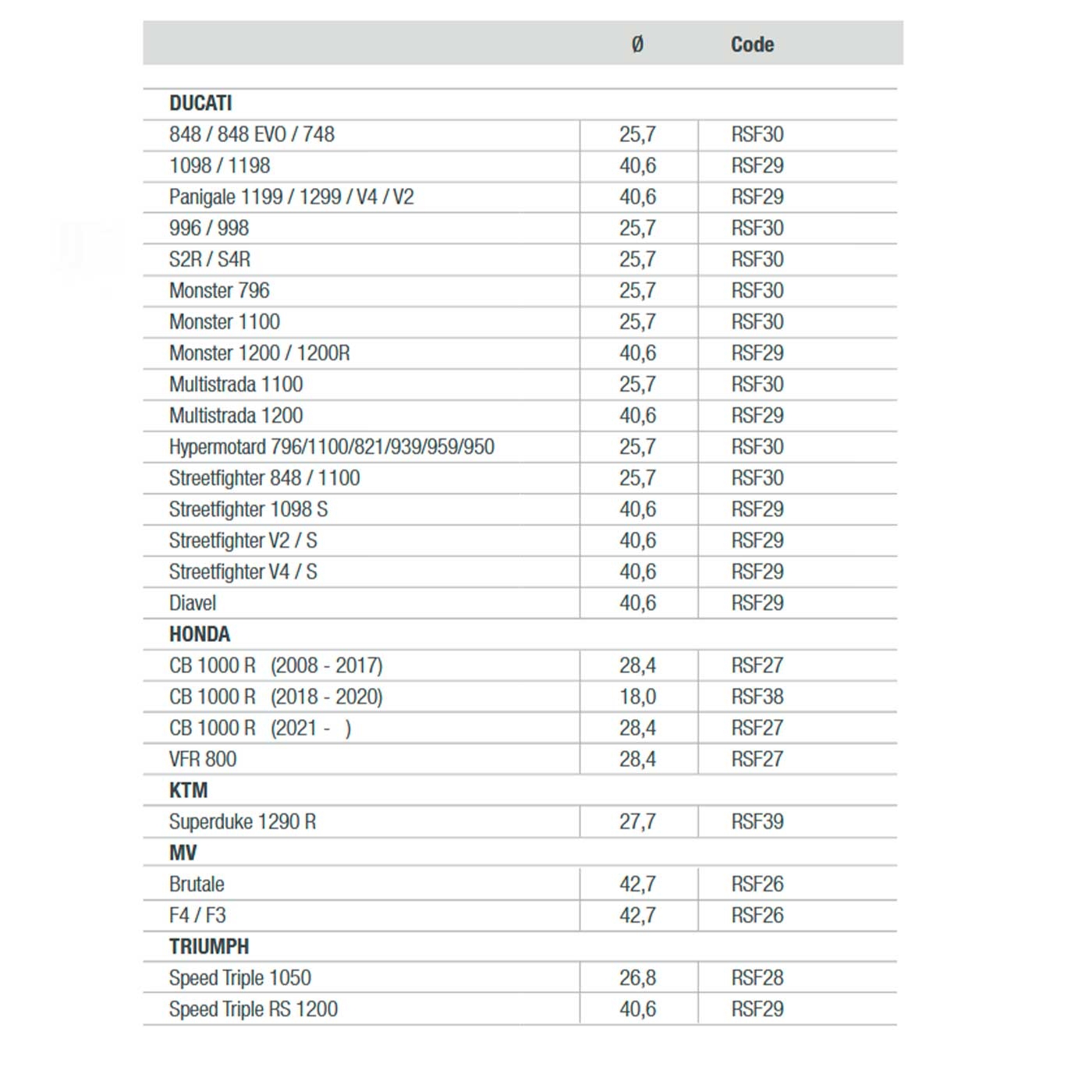 Ø40,6 – RSF29 → Ducati 1098/1198, Panigale (1199, 1299, V4, V2), Monster 1200, Multistrada 1200, Streetfighter 1098S / V2 / V4, Diavel, Triumph Speed Triple RS 1200.
