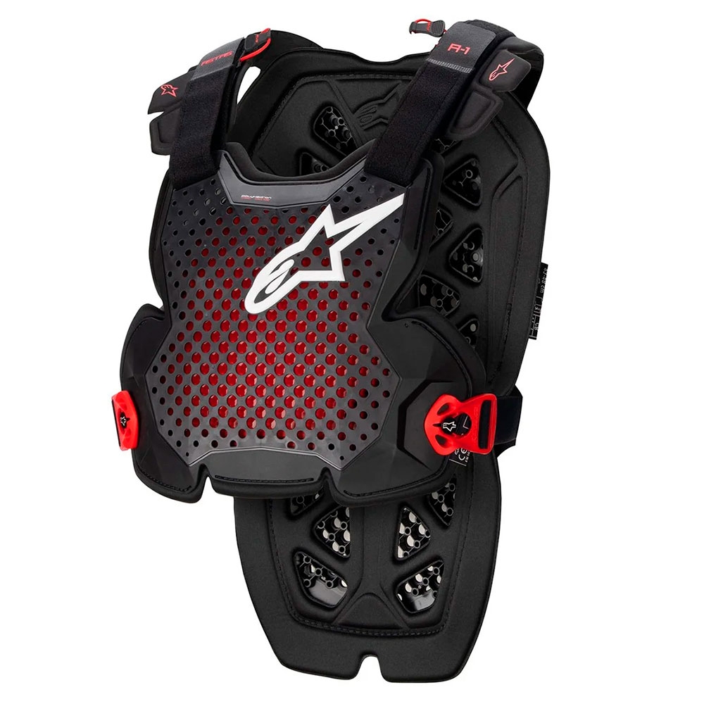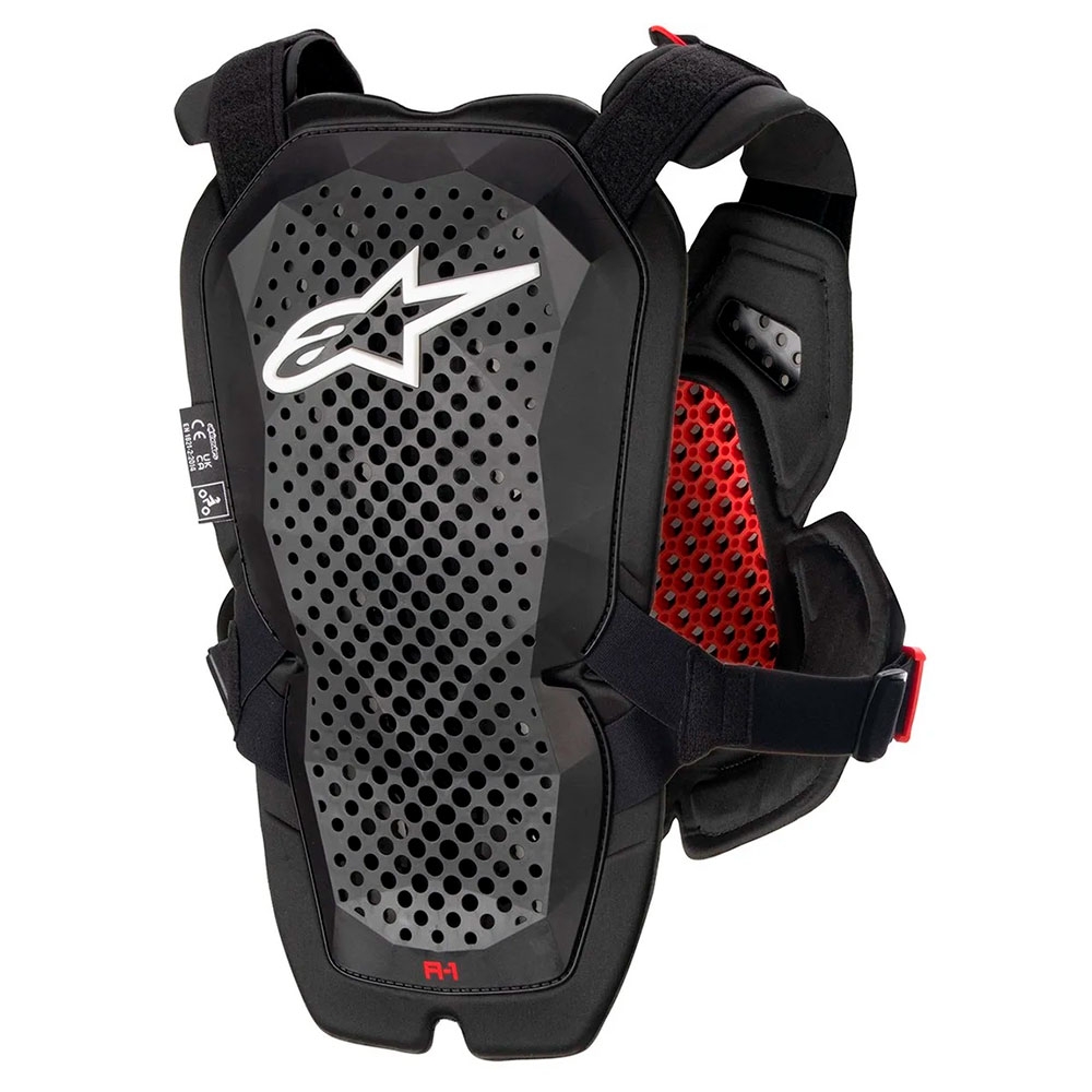 Peto Alpinestars A-1 Pro Chest Antracita / Negro / Rojo. El protector de motocross Alpinestars A-1 Pro Chest está equipado con un protector de pecho con tecnología híbrida de poliedro certificado CE y UKCA de nivel 1 y un protector de espalda con tecnología de poliedro. Garantiza una excepcional ventilación, es extremadamente ligero y proporciona una óptima seguridad contra los impactos en la zona superior del cuerpo. El protector Alpinestars A-1 Pro Chest se puede combinar con collarines Alpinestars BNS.