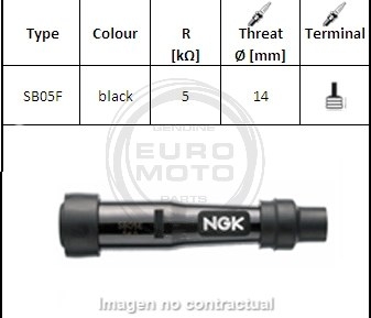 Pipa bujía Ngk SB05F. Pipa bujía Ngk SB05F con los estándares más exigentes de calidad. Su tecnología puntera garantiza un nivel de prestaciones que da respuesta incluso a las situaciones más extremas. La bujía NGK SB05F se suministra siempre por unidad. La imagen mostrada es genérica. Adjuntamos a cada producto un catalogo PDF de bujías y pipias de bujía para moto NGK con toda la información.