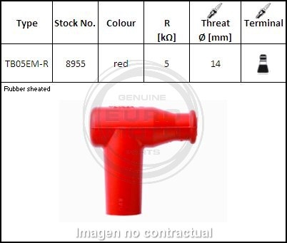 Pipa bujía Ngk TB05EMR. Pipa bujía Ngk TB05EMR con los estándares más exigentes de calidad. Su tecnología puntera garantiza un nivel de prestaciones que da respuesta incluso a las situaciones más extremas. La bujía NGK TB05EMR se suministra siempre por unidad. La imagen mostrada es genérica. Adjuntamos a cada producto un catalogo PDF de bujías y pipias de bujía para moto NGK con toda la información.