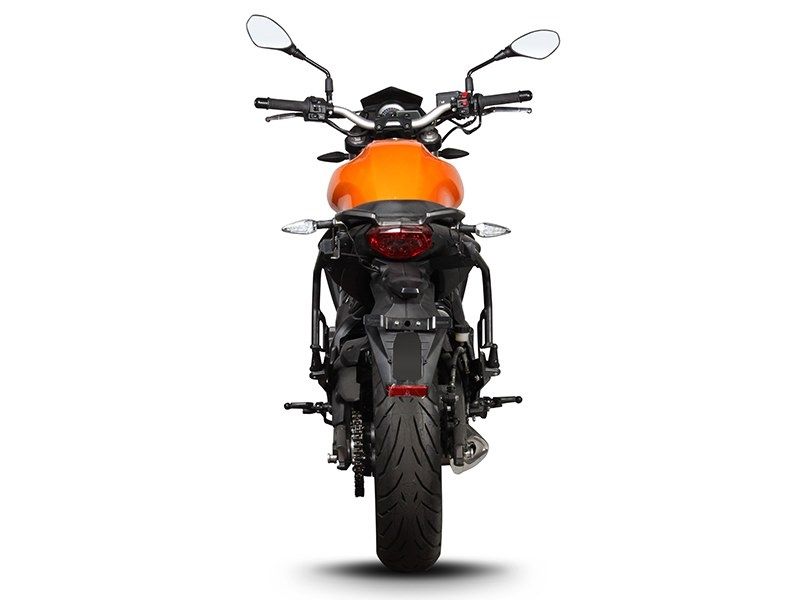 La fijación lateral queda mejor integrada en la moto. El típico marco rectangular se reduce a un único brazo sobre el que se apoyan los tres puntos (3P) de fijación de la maleta.