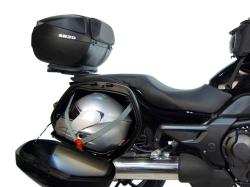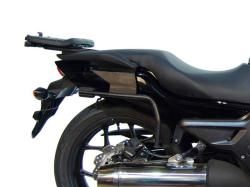 La fijación lateral queda mejor integrada en la moto. El típico marco rectangular se reduce a un único brazo sobre el que se apoyan los tres puntos (3P) de fijación de la maleta.