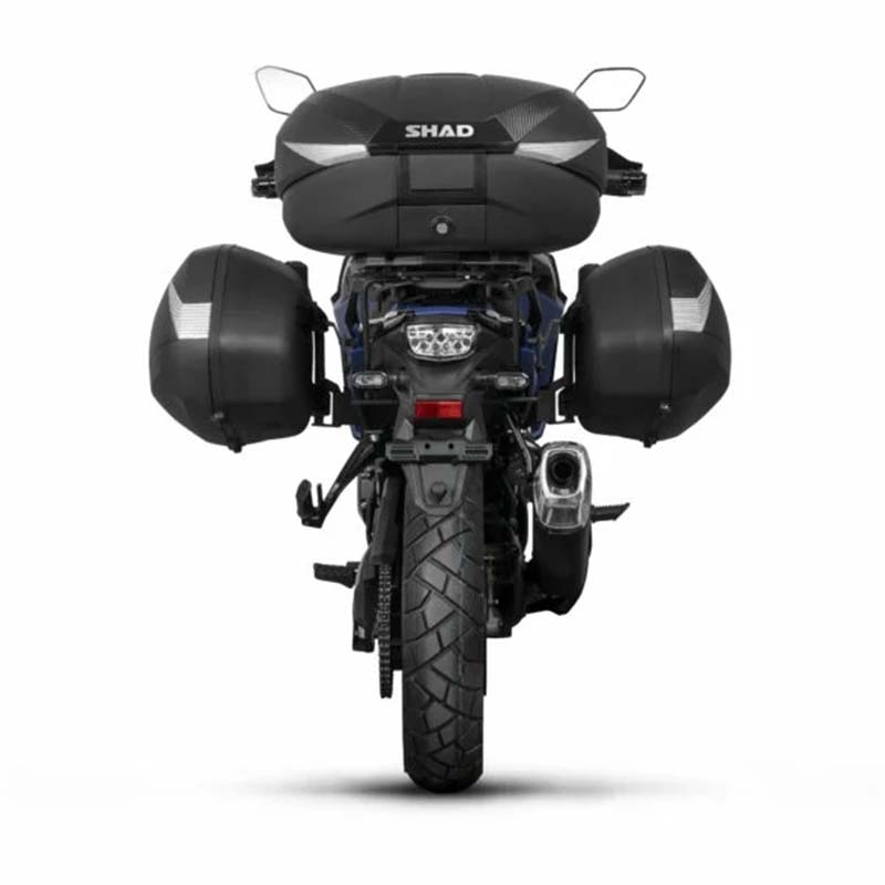 Este portamaletas lateral permite montar maletas laterales Shad compatibles con 3P (por ejemplo, las series SH35/SH36/SH38 y equivalentes). Es la base estructural sobre la que se fijan las maletas, garantizando resistencia y alineación correctas.