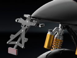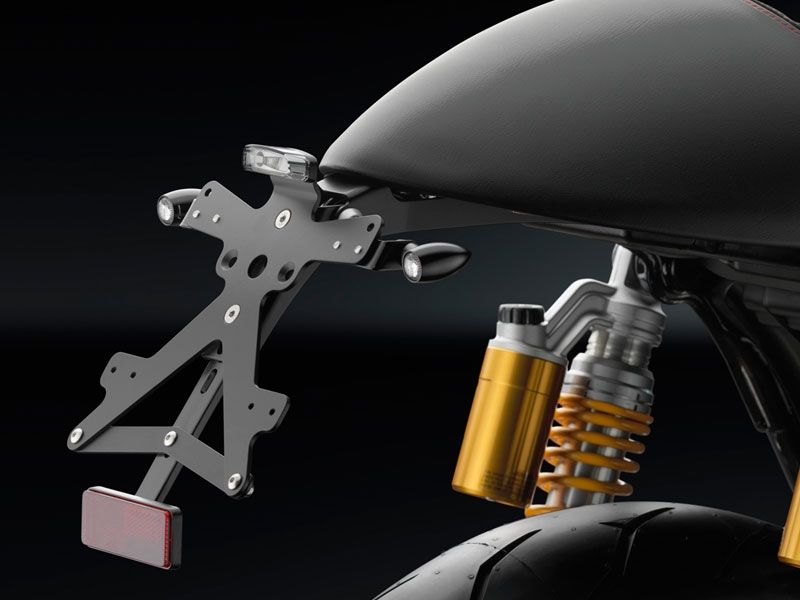 Portamatrícula Rizoma PT664B Fox Triumph Thruxton 1200 2017. El portamatrícula Rizoma PT664B está perfectamente diseñado para garantizar resistencia estructural y fiabilidad en espacios y dimensiones muy reducidas. El kit Rizoma PT664B está realizado a partir de un bloque macizo de aluminio para ofrecer resistencia y ligereza. El portamatrícula Rizoma PT664B Fox posee la conformidad de los estándares europeos. Incluye soporte de matrícula, iluminación, catadióptrico y ajuste regulable. El anclaje esta estudiado para una fácil y rápida instalación, sin descuidar la estética.