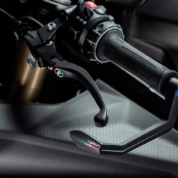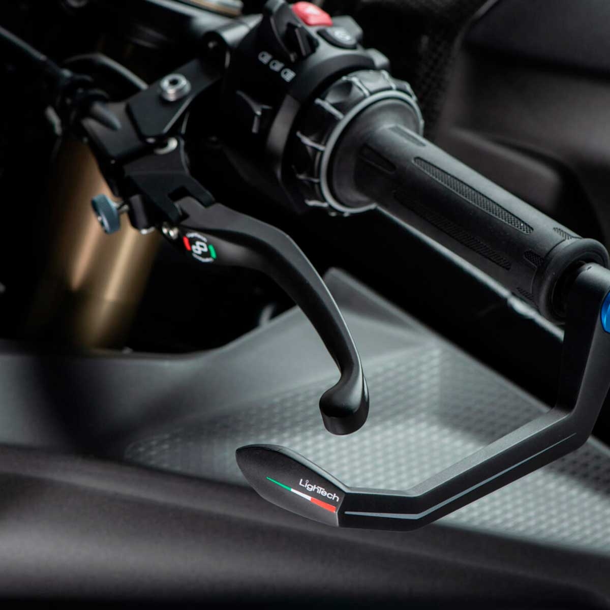 La protección de maneta GC-Tech de Lightech cuenta con un nuevo diseño de 135 mm, especialmente pensado para el lado izquierdo de la moto (embrague). Su estética combina la funcionalidad racing con detalles exclusivos como el logo Lightech y los colores de la bandera italiana en el terminal, aportando un toque único de diseño y originalidad.