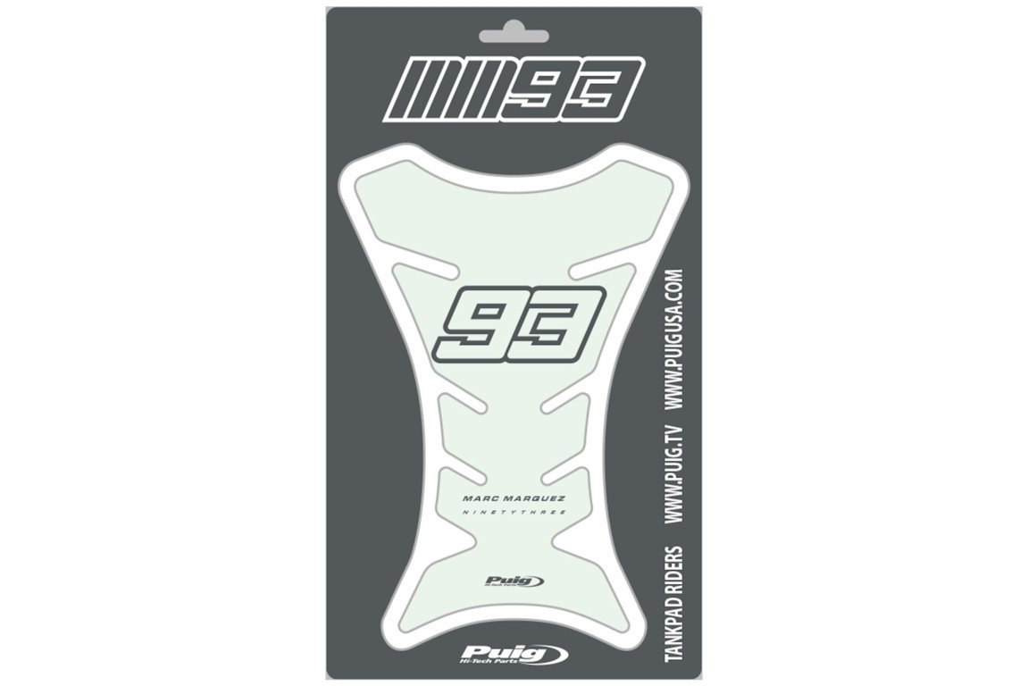 Protector depósito Puig 20682W 93 Marc Márquez transparente. Nuevo adhesivo protector de depósito Puig 20682W 93 con la colaboración exclusiva del piloto de MotoGP, Marc Márquez. Su diseño universal permite adaptarse a a la gran mayoría de depósitos racing del mercado. Gracias a su excelente calidad, ofrece protección contra los arañazos además de un look personalizado. La fijación adhesiva es muy resistente y duradera. El protector de depósito Puig 20682 93 de Marc Márquez está disponible en acabado transparente o símil carbono.