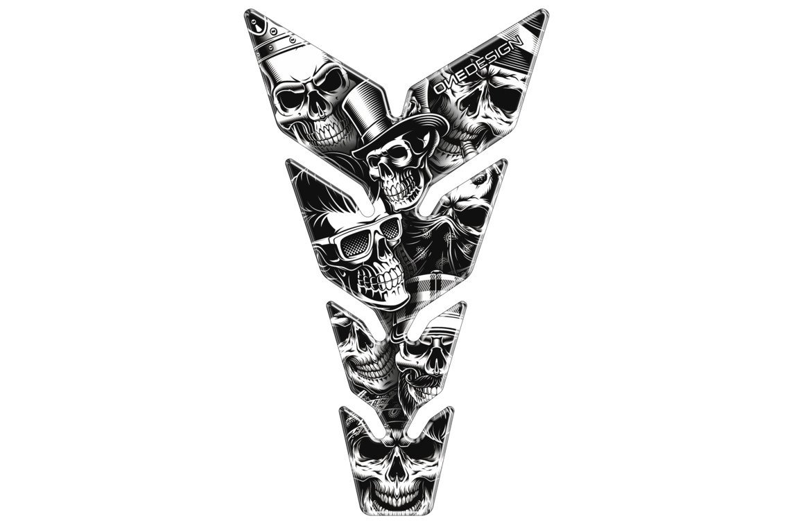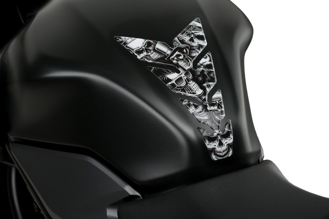 Protector depósito Puig Skull Party 20594N Black & White. Nuevo adhesivo protector de depósito Puig Skull Party 20594N con diseño universal que permite adaptarse a a la gran mayoría de depósitos racing del mercado. Gracias a su excelente calidad, ofrece protección contra los arañazos además de un look personalizado. La fijación adhesiva es muy resistente y duradera.