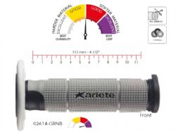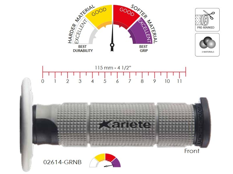 Puños Ariete 02614-GRNB Trinity. Nuevos puños de motocross Ariete Trinity 02614-GRNB con diseño asimétrico y realizados en 3 compuestos de material para una excelente agarre y óptima durabilidad. El piloto utiliza cada puño de forma diferente, por esa razón el Ariete Trinity es la solución perfecta: 2 puños que se diferencian por la funcionalidad y el confort, cada uno diseñado para garantizar las máximas prestaciones. Sus 3 compuestos diferentes se han ubicado en zonas específicas para optimizar la adherencia y la durabilidad del producto.