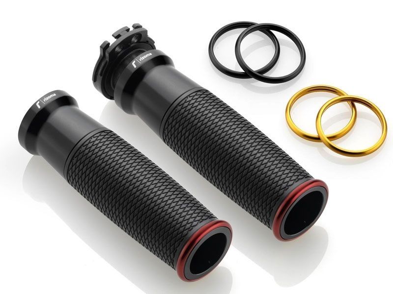 Puños Rizoma GRDW222Z21B Urlo Negro Ride by Wire. Nuevos puños Rizoma GRDW222Z21B Urlo de la gama Ride By Wire destinados para los modelos de moto que llevan comando de acelerador electrónico. Los puños Urlo de Rizoma están realizados a partir de un bloque único de aluminio para garantizar el máximo refinamiento y durabilidad. Los Urlo se caracterízan por su diseño ergonómico y por el máximo grip que ofrecen. Incluye anillos de aluminio intercambiable disponibles en 3 colores diferentes (oro, negro y rojo). Diámetro: 22 mm.