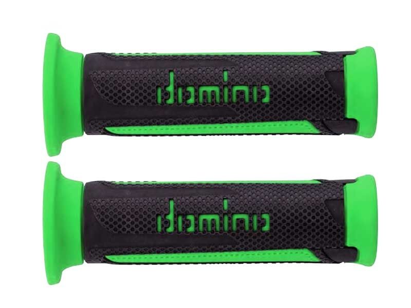Puños Domino A35041C4470 Turismo Antracita / Verde. Diseñado específicamente para ofrecer un excelente confort en motos de turismo y maxiscooter. Los puños Domino A350 ofrecen un diseño muy atractivo y moderno y están disponibles en una gran combinación de colores. Están realizados con goma termoplástica bicolor para proporcionar un excelente confort y durabilidad. El diseño del dibujo junto con el troquelado aportan al motorista un agarre, tacto y sensación de control óptimos. Longitud de 120 mm / Final abierto.