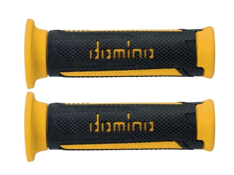 Puños Domino A35041C4570 Turismo Antracita / Amarillo. Diseñado específicamente para ofrecer un excelente confort en motos de turismo y maxiscooter. Los puños Domino A350 ofrecen un diseño muy atractivo y moderno y están disponibles en una gran combinación de colores. Están realizados con goma termoplástica bicolor para proporcionar un excelente confort y durabilidad. El diseño del dibujo junto con el troquelado aportan al motorista un agarre, tacto y sensación de control óptimos. Longitud de 120 mm / Final abierto.