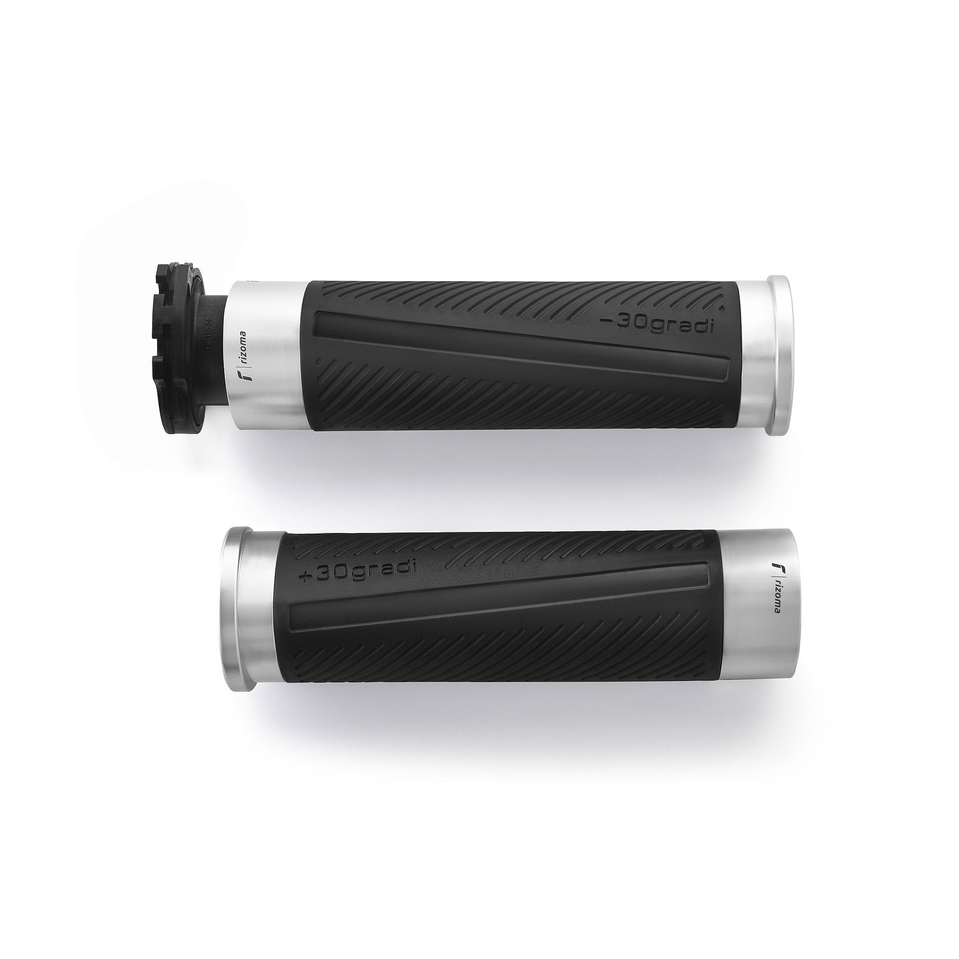 Puños Rizoma 30Gradi GR224A Plata. Los nuevos puños 30Gradi de Rizoma han sido desarrollados pensando sobretodo, en optimziar el contacto entre el puño y la ergonomía de la mano, transmitiendo al motorista mayor comodidad y feeling además de una excelente durabilidad. Si nos fijamos en la sección de los puños Rizomas 30Gradi, el perfil exterior es triangular, con una torsión de 30⁰, de manera que el motorista recibirá mayor sensación de control y un agarre mas cómodo. Estos elegantes puños, están realizados en aluminio a partir de un bloque macizo y disponibles en diferentes coloraciones, obtenidas a través de procesos de anodización que le confieren y garantizan el mejor rendimiento estético en el tiempo.