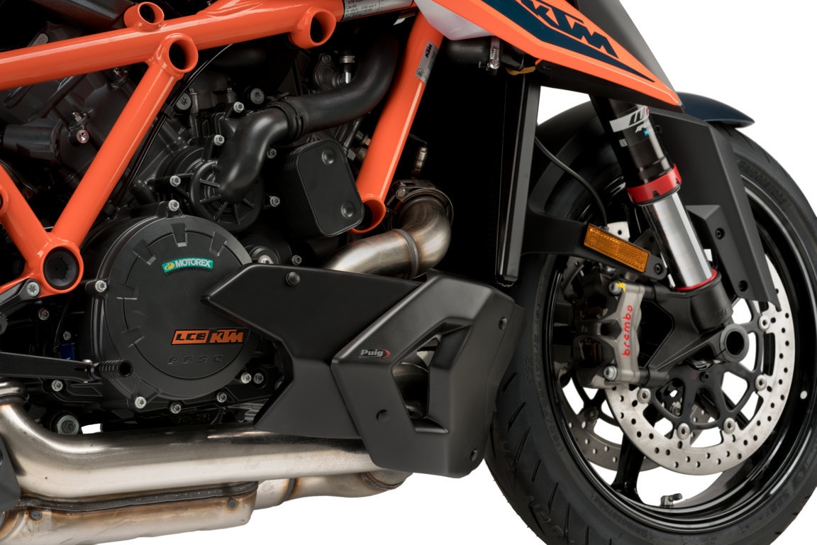 Quilla motor Puig 20428J KTM 1290 SuperDuke R 2020-2021 negro mate. ¡Mejora la estética de tu KTM 1290 Superduke R 2020-2021!. Quilla de motor Puig 20428 diseñada específicamente para este modelo de moto y que se caracteriza por ofrecer acabados de máxima calidad. Realizada en Abs altamente resistente, la quilla de motor Puig 20428 incorpora herrajes e instrucciones para un montaje rápido y sencillo. Incluye kit adhesivos y está disponible en color símil carbono y negro mate. Homologación ABE 30653 y TUV.