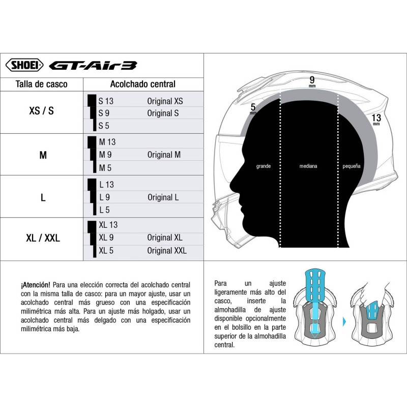 Estas tallas varían en grosor y son intercambiables dentro del rango de tallas de la calota interna del casco que van desde "M5" (más delgado) hasta "M13" (más grueso). Si el acolchado interior de tu casco SHOEI Neotec 3 o GT-Air 3 está desgastado o ya no puede limpiarse de manera efectiva, reemplazarlo es esencial para mantener la higiene y la comodidad. Esto es especialmente relevante si has utilizado tu casco durante un largo periodo.