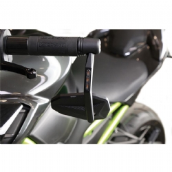 Este modelo pertenece a la gama Highsider Pro y se vende por unidad, aunque su instalación se realiza siempre por parejas (uno por cada lado del manillar) para sustituir los intermitentes originales. El cuerpo del espejo y el brazo están fabricados en aluminio anodizado negro finamente granallado, con una cuidada superficie fresada CNC y un sistema de fijación interior en el manillar que deja el conjunto muy integrado.