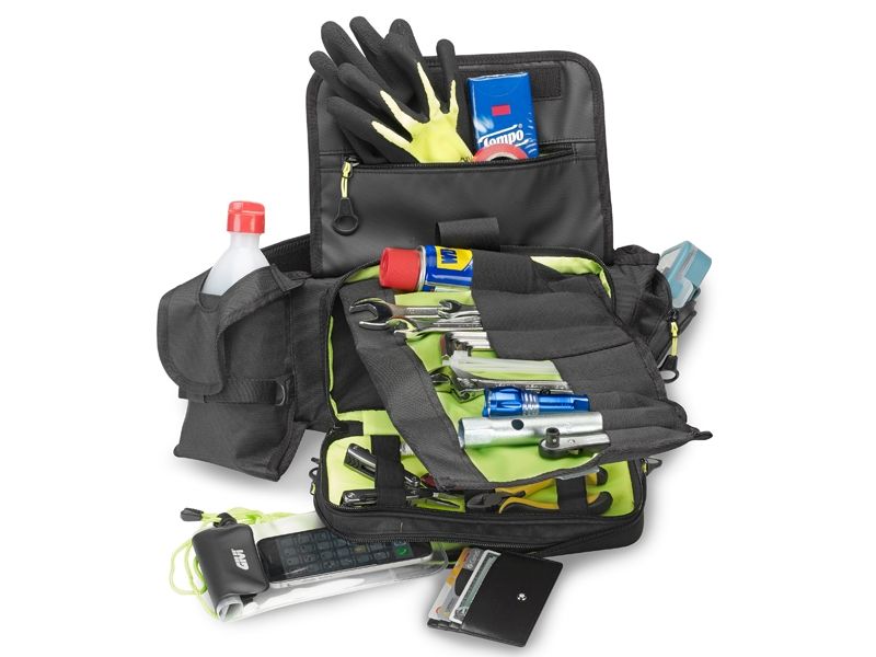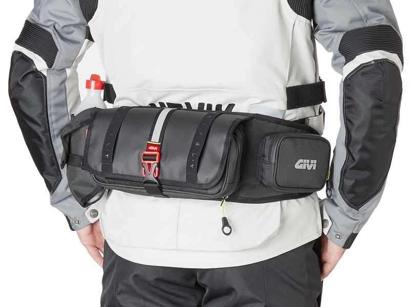 Bolsa Riñonera motorista Givi GRT710 (Línea Gravel-T Range). Práctica bolsa riñonera Givi GRT710 muy funcional gracias a su amplio compartimento principal para transportar objetos. Además dispone de un porta botella y porta smartphone, este último con con resistencia a la lluvia IP65. Confeccionada con tejido altamente resistente 1200D, todos los materiales con los que está realizada la bolsa Givi GRT710, cumplen con la normativa ISO 4892 – 2.