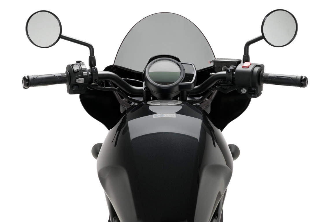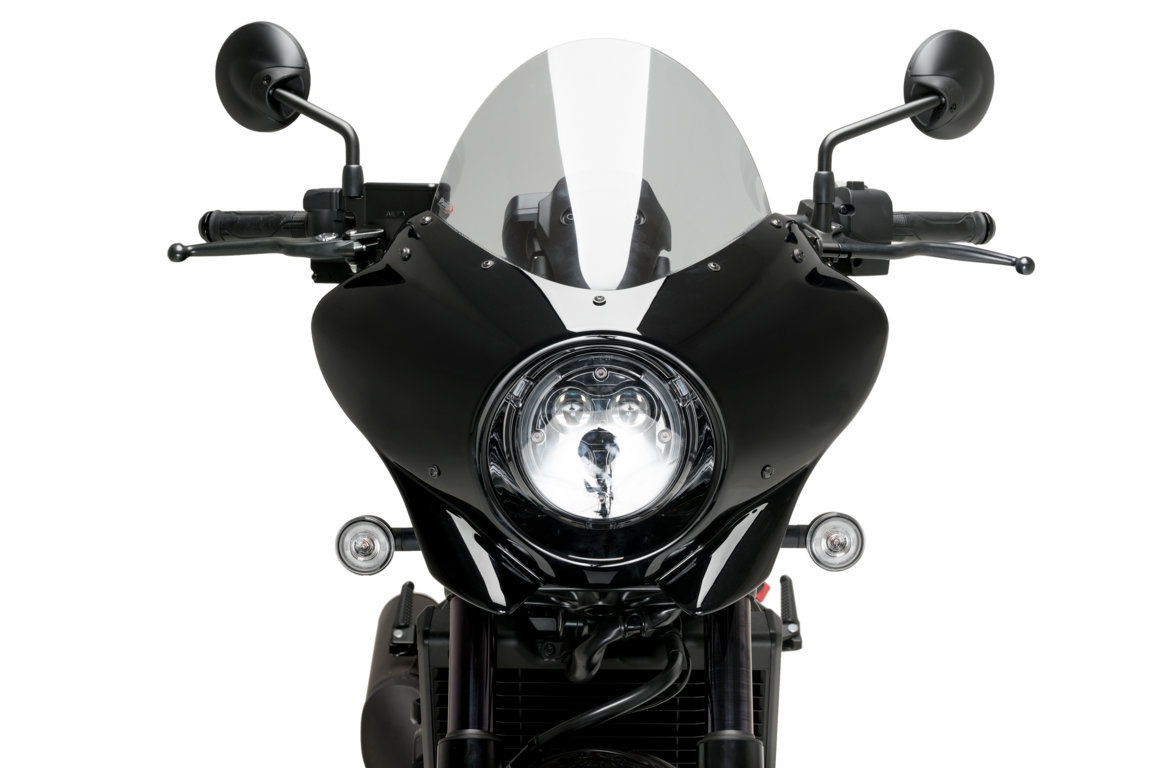 El semicarenado Mirage es un accesorio sumamente versátil, ya que se ajusta fácilmente a motocicletas con faro redondo, cubriendo la parte frontal alrededor del faro y protegiéndolo de la suciedad y posibles impactos menores. Se pueden instalar dos tipos diferentes de cúpulas: la Sport, de aspecto más agresivo y minimalista, y la Touring, que brinda mayor protección aerodinámica. Las cúpulas están disponibles en colores transparente, ahumado claro y ahumado oscuro, y se pueden combinar con el semicarenado Mirage, que viene en acabados negro mate o negro brillante.