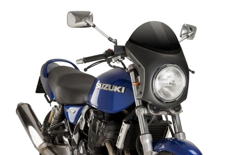 Semicarenado Retro Puig 9515N Triumph Street Twin 2016 (carcasa símil carbono y cúpula negra). Semicarenado Puig 9515N de alta calidad y realizado en resistente ABS. Ideal para los motorista que quieren tener más protecciónn contra del viento además de darle un toque diferente y único a su moto. Cuenta con 2 Puntos de sujeción y medidas de 405 mm x 300 mm (alto x ancho). Diámetro de 195 mm. Posee la homologación ABE 39524 y TÜV.
