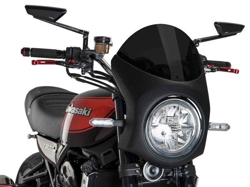 Semicarenado Retro Puig 9596F Kawasaki Z900RS 2018 (carcasa símil carbono y cúpula ahumada oscura). Semicarenado Puig 9596 de alta calidad y realizado en resistente ABS. Ideal para los motorista que quieren tener más protecciónn contra del viento además de darle un toque diferente y único a su moto. Posee la homologación ABE 39524 y TÜV.