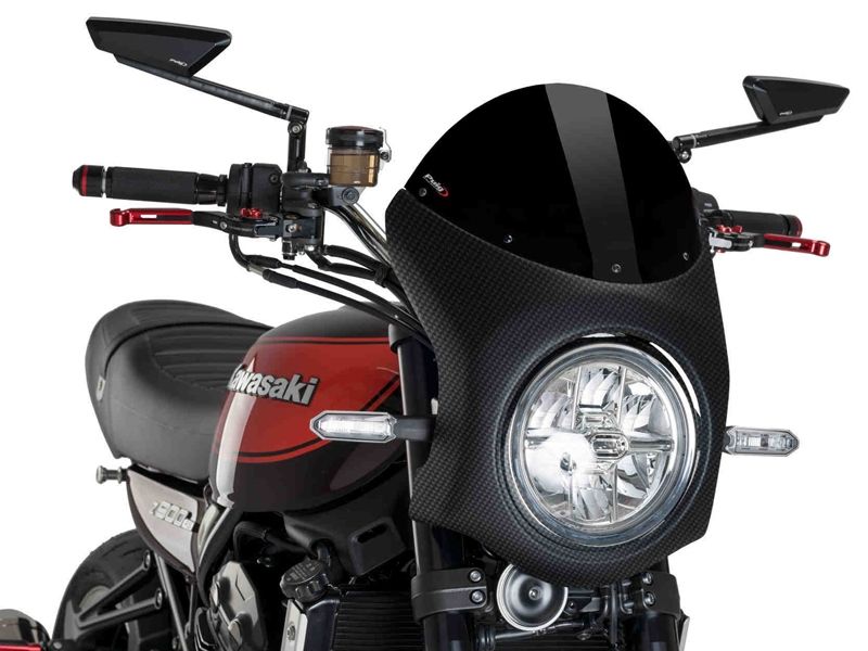 Semicarenado Retro Puig 9596N Kawasaki Z900RS 2018 (carcasa símil carbono y cúpula negra). Semicarenado Puig 9596 de alta calidad y realizado en resistente ABS. Ideal para los motorista que quieren tener más protecciónn contra del viento además de darle un toque diferente y único a su moto. Posee la homologación ABE 39524 y TÜV.