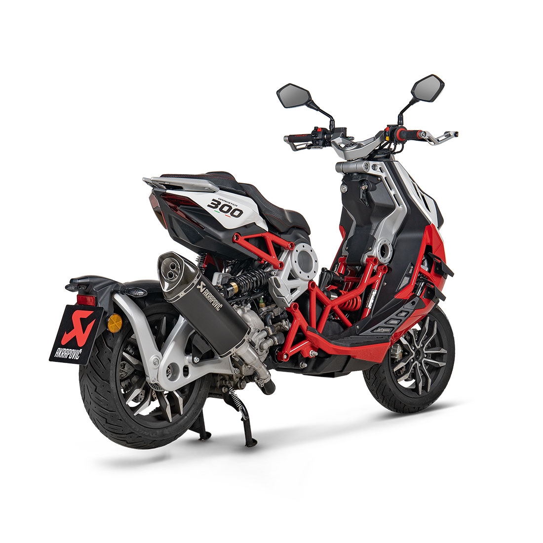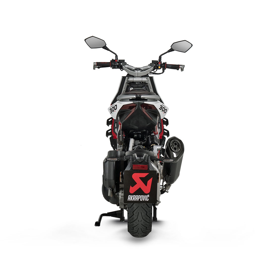 - Materiales de alta calidad: Este escape cuenta con una manga exterior de titanio pintada de negro, complementada con un logotipo Akrapovič grabado. Un tubo de conexión de acero inoxidable y una tapa final hecha a mano en fibra de carbono completan el diseño, aportando un aspecto deportivo que se integra perfectamente con las líneas futuristas de la Italjet Dragster 300.