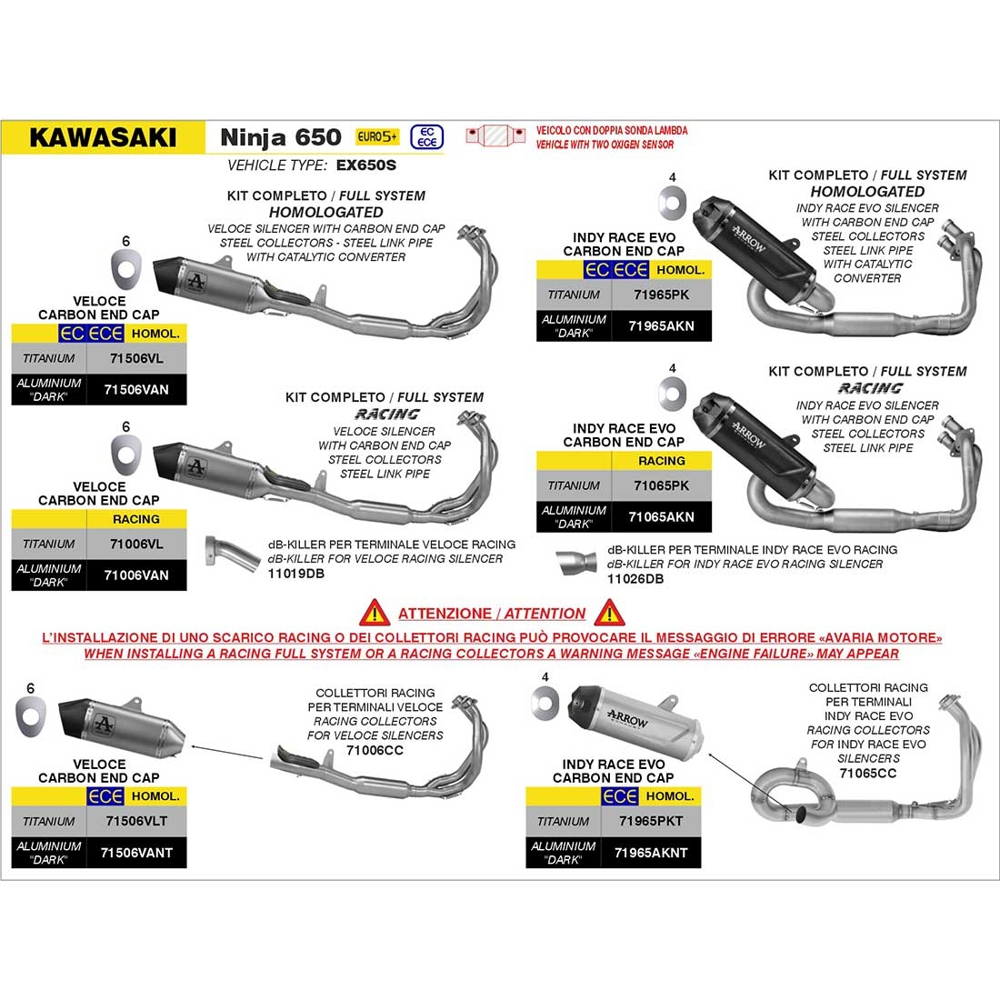 Los Arrow Veloce 71506VLT (titanio) y 71506VANT (aluminio Dark) son silenciosos Veloce con carbon end cap desarrollados para la Kawasaki Ninja 650 Euro 5+ 2024-2025 (EX650S). Ofrecen un diseño deportivo, una notable reducción de peso frente al escape original y un sonido más lleno y agresivo, manteniendo la homologación ECE del silencioso.