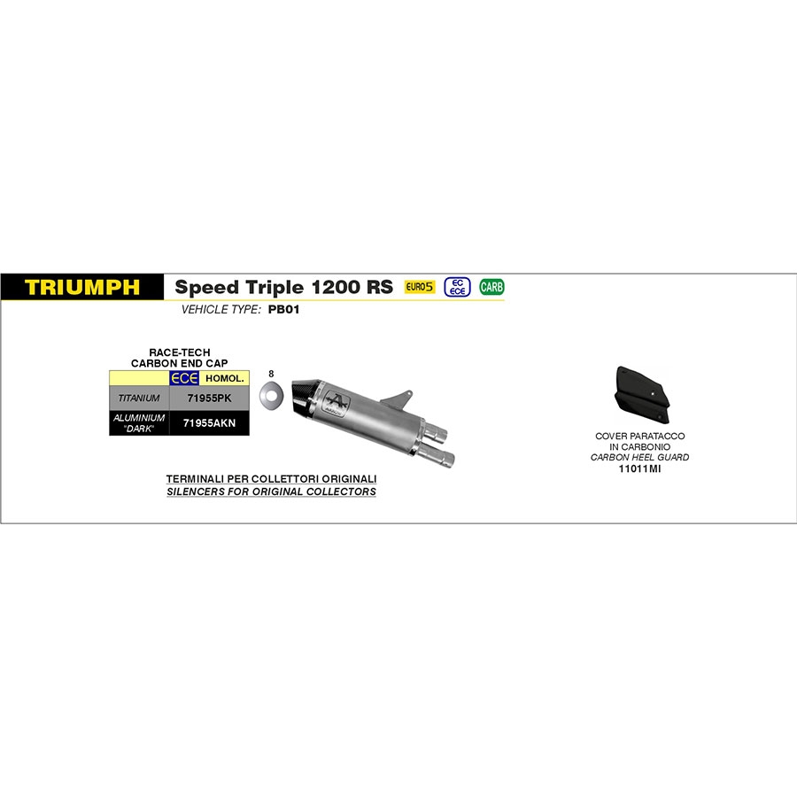 Silencioso escape Arrow 71955PK Race-Tech Triumph Speed Triple 1200 RS 2021-2023. El silencioso de escape moto Arrow 71955PK Race-Tech para Triumph Speed Triple 1200 RS 2021-2023 se caracteriza por su diseño en forma de diamante que garantiza una disminución del peso, sin afectar el volumen interno ni los niveles de ruído. Realizado interiormente en acero inox con la funda exterior en diferentes materiales (titanio, carbono o aluminio según modelo), cuenta con el terminal (copa final) en carbono y dB-killer extraíble. (La información que facilita Ramirez Motoracing es orientativa y sujeta a la verificación en la web del fabricante).