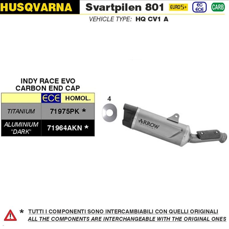 Silencioso escape Arrow 71975AKN Indy Race EVO Aluminio Dark Husqvarna Svartpilen 801 2024 (homologado). Silencioso Escape Arrow 71975AKN/71975PK Indy Race EVO para Husqvarna Svartpilen 801 2024. La línea Indy Race EVO de Arrow se ha desarrollado para ofrecer un equilibrio perfecto entre rendimiento, estilo y ligereza para tu Husqvarna Svartpilen 801 2024. Tanto en su versión de aluminio "Dark" con fondo de carbono (71975AKN) como en la opción de titanio con fondo en carbono (71975PK), estos silenciosos aportan una mejora notable en el sonido, la estética y las prestaciones de tu moto.