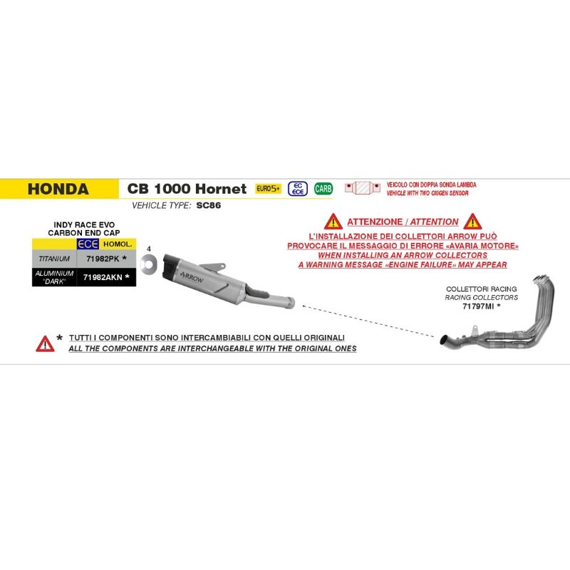 Silencioso escape Arrow 71982PK Indy Race EVO Honda CB 1000 Hornet 2025 titanio fondo carbono. Escapes Arrow Indy Race EVO & Colectores Racing 71797MI para Honda CB 1000 Hornet 2025. Mejora el rendimiento y el sonido de tu Honda CB 1000 Hornet 2025 con los escapes Arrow Indy Race EVO y los colectores racing Arrow 71797MI. Fabricados con materiales de alta calidad y diseñados para una instalación precisa, ofrecen un sonido más deportivo y una respuesta mejorada del motor.