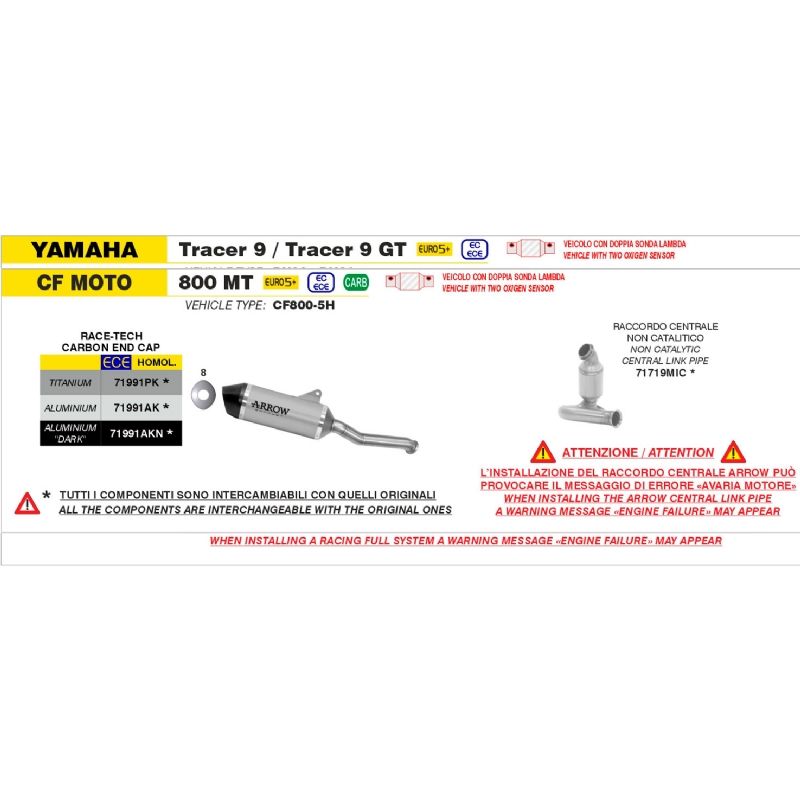 Este silencioso es compatible con el sistema original de escape, pero también puede montarse en combinación con el conector central Arrow 71719MIC (no homologado), que elimina el catalizador original.