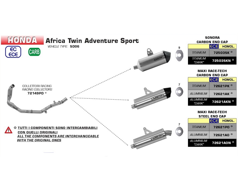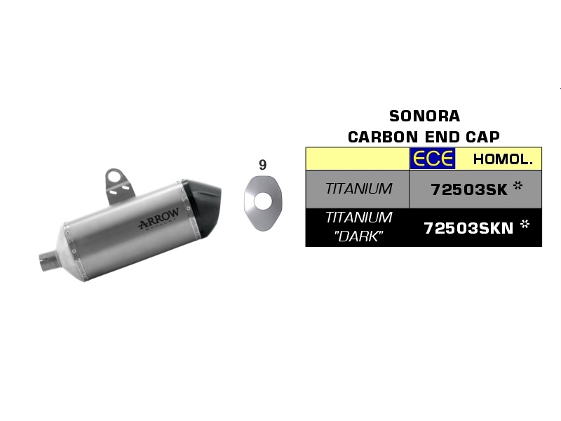Silencioso escape Arrow 72503SK Sonora de titanio fondo en carbono Honda CRF 1000L Africa Twin 2016/2019. El nuevo escape Arrow Sonora ha sido diseñado para motos Maxi Enduro de última generación y desarrollado en las carreras de Off-Road, es decir, sobre las condiciones de uso son más extremas. Arrow Sonora maximiza las prestaciones generales de la moto con un sonido envolvente e inconfundible que hará que disfrutes todavía más obre tu moto. El cuerpo principal posee un diseño de forma compacta y está realizado en titanio para ofrecer la máxima resistencia y ligereza, consiguiendo una maniobrabilidad superior sobre cualquier tipo de conducción pero en especial en la de Off-Road. (La información que facilita Ramirez Motoracing es orientativa y sujeta a la verificación en la web del fabricante).