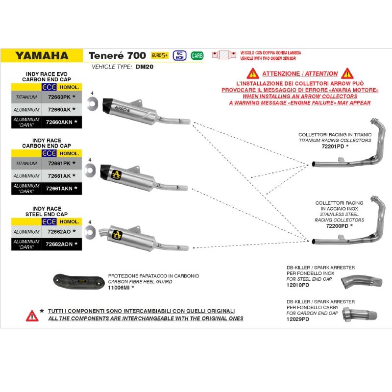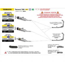 Este silencioso puede instalarse tanto sobre los colectores originales de Yamaha como sobre los colectores racing Arrow 72200PD (acero) y 72201PD (titanio). Al instalar colectores racing, puede aparecer un mensaje de error en la centralita ECU debido a la eliminación del catalizador.