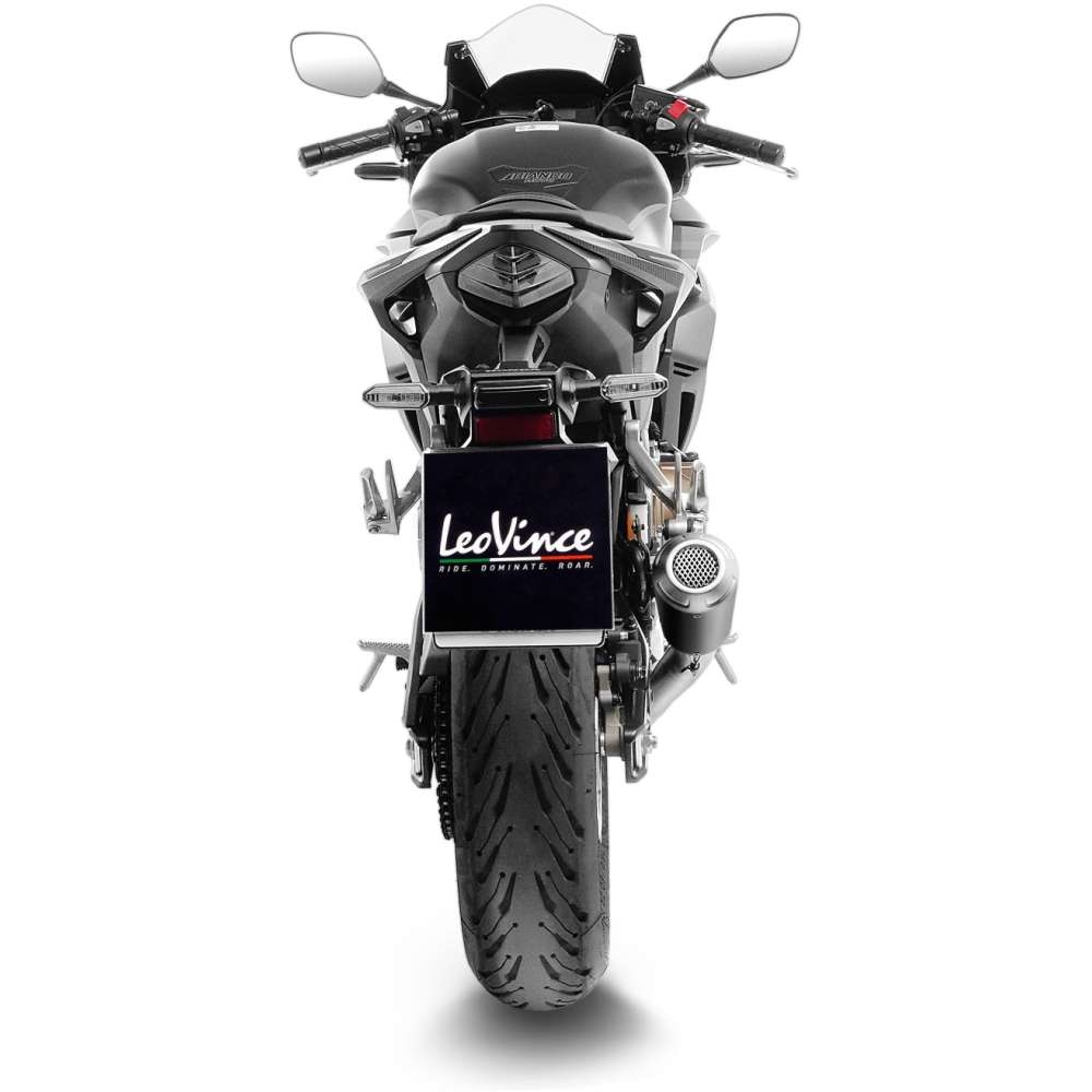 Silencioso escape LeoVince 15236B LV-10 Black Honda CB 500 F 2019-2020. El escape LeoVince LV-10 racing es el resultado de la colaboración con los mejores equipos de Moto2 y Moto3 y el saber hacer adquirido durante años de experiencia en las carreras de MotoGP y SBK. Leovince ha desarrollado un silencioso muy compacto para garantizar la máxima ligereza, el máximo rendimiento y el inconfundible sonido racing LeoVince. Completamente realizado en acero inox AISI 304, el silencioso Leovince LV-10 tiene un acabado mate y el logo LeoVince marcado por láser. La copa de salida con acabado arenado está equipada con una red especial apagachispas para infundir en el silenciador un aspecto muy racing.
