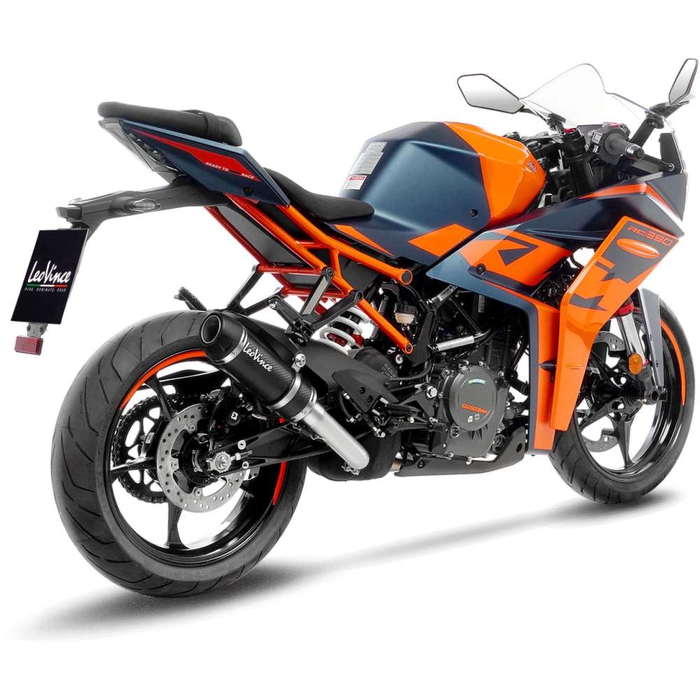 Silencioso escape Leovince 15501EU GP Corsa KTM RC 125 E5 2022-2023. El escape LeoVince Gp Corsa Evo representa el mejor equilibrio entre look, rendimiento y precio para motocicletas de 4 tiempos hasta 500cc de cilindrada. Su diseño deriva de MotoGP y está fabricado en carbono con copa de salida en tecnopolímero. Dispone de un adhesivo en aluminio embellecedor con el logo de la marca.