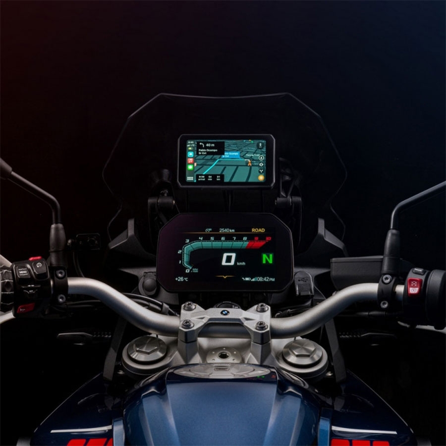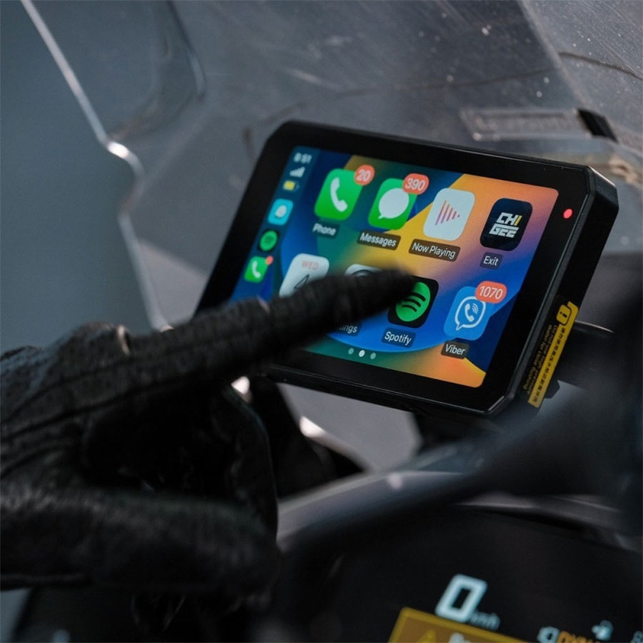 La pantalla táctil de 5” del Chigee AIO-5 Play ofrece una interfaz minimalista y controles fáciles de usar, incluso con guantes de moto. Además, su sistema de reconexión automática permite que, una vez configurado, solo tengas que arrancar tu moto para empezar a disfrutar.