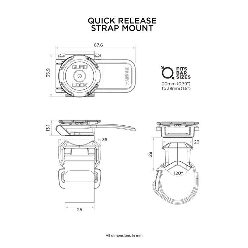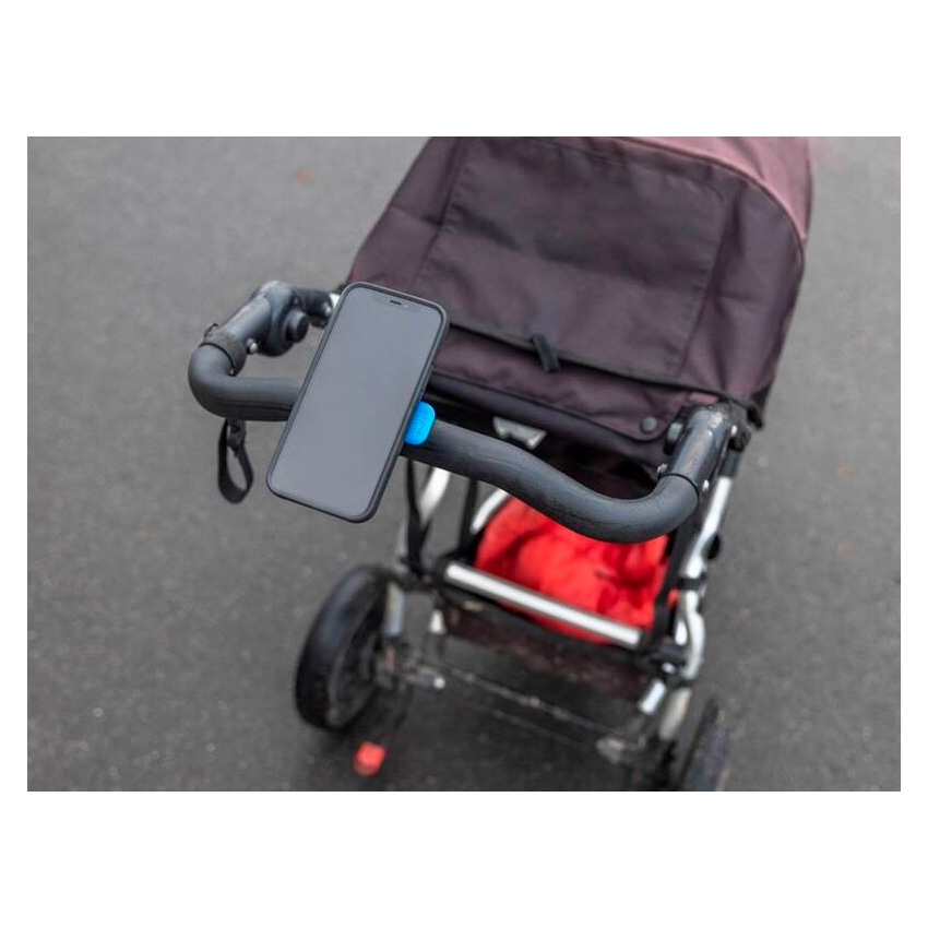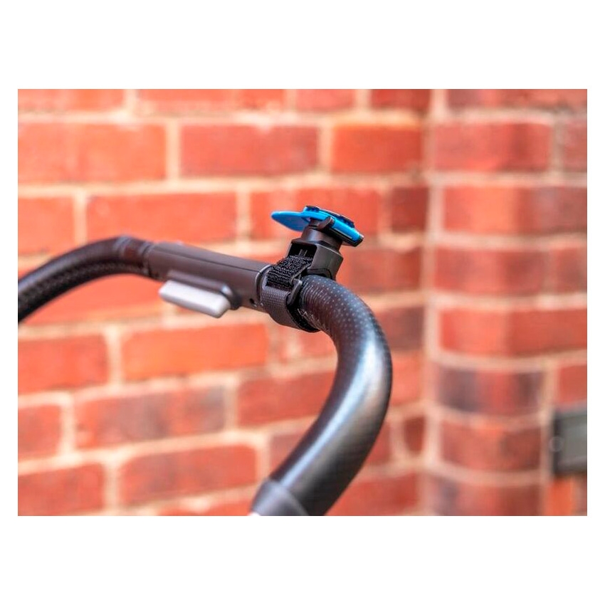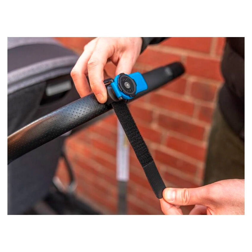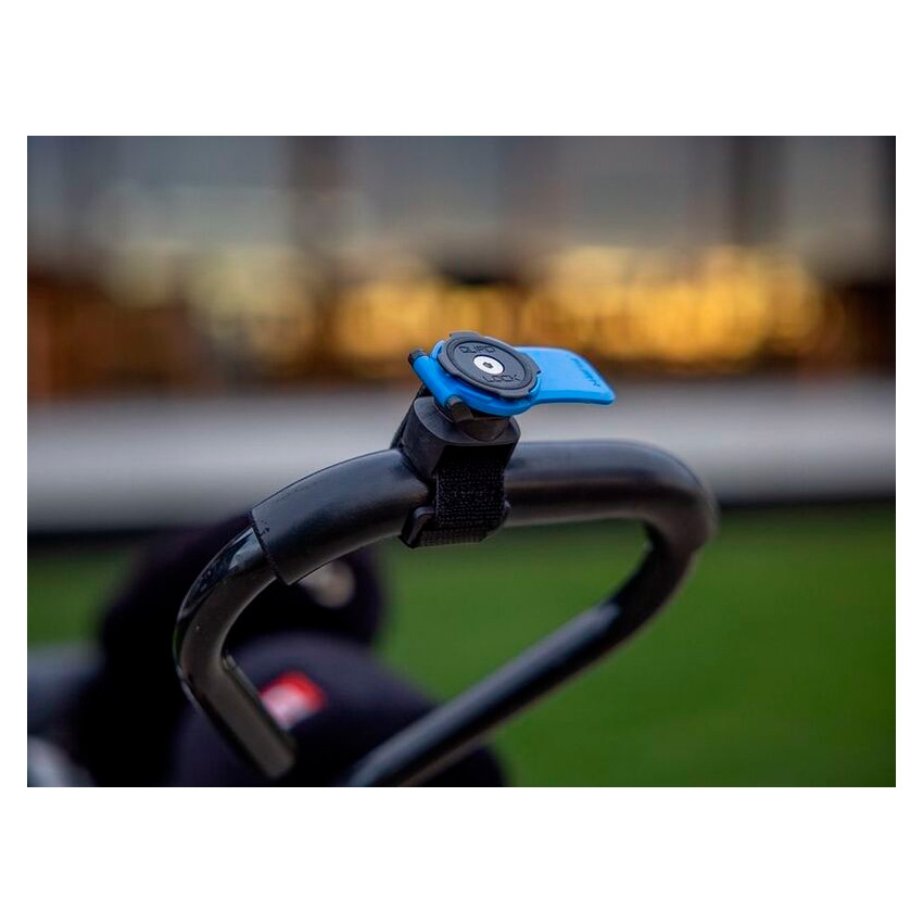 La correa de poliuretano antideslizante con textura del soporte Quad Lock asegura un montaje estable sin la necesidad de herramientas adicionales. Su diseño adaptable se fija sin problemas a una amplia gama de asas y barras, desde el carrito de golf hasta el cochecito de tu bebé.