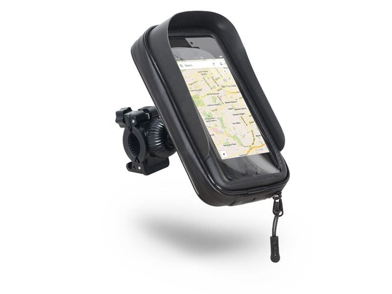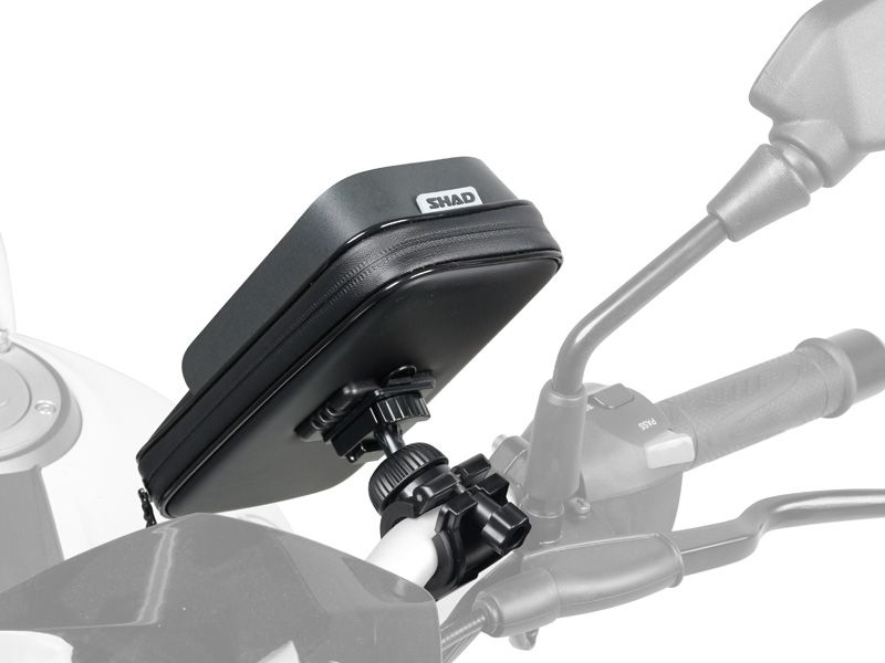 Porta-Smartphone Shad X0SG61H (Manillar). Soporte impermeable para Smartphones de 6 pulgadas con sujeción a manillar. El accesorio perfecto para los motoristas que disfrutan de los viajes largos o simplemente circulando por la ciudad. El nuevo soporte Smartphone está fabricado de manera extremadamente robusta y práctica, con interior forrado en material resistente a los golpes. La base puede girarse 360°, lo que permite colocar la pantalla en el ángulo visual más adecuado para el motorista. Su estuche y cremalleras impermeables permite que el soporte sea utilizado en cualquier tiempo, y su pantalla táctil es completamente funcional gracias a su film transparente para pantallas táctiles. Ofrece la máxima protección para el Smart Phone, ya que incluye una correa de seguridad. El montaje es fácil y rápido.